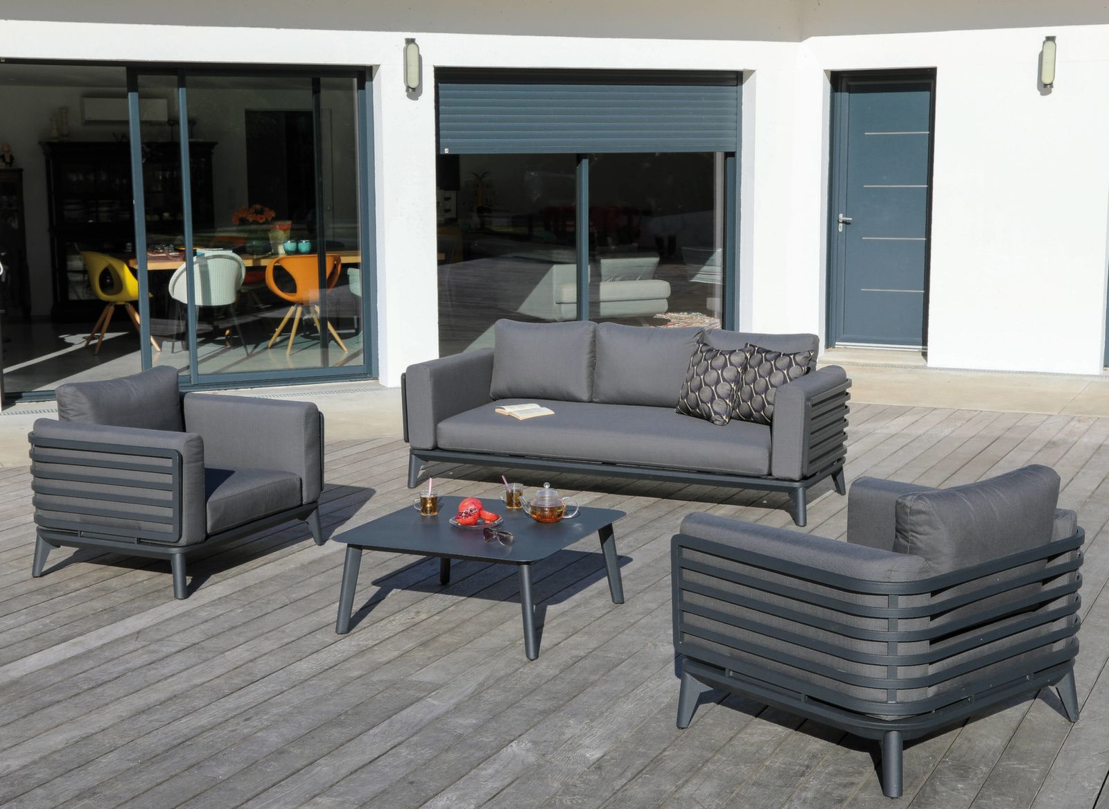 La structure des fauteuils et du canapé et de la table basse Moss 2 est en aluminium. L’aluminium ne subit pas la corrosion, il est prêt à séjourner à l’extérieur par tous les temps, si bien que ce salon détente peut même être utilisé dans les zones proches de la mer !